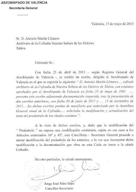 El Arzobispado ha remitido la carta en la que notifica que aprueba la modificación del preámbulo de los estatutos de la Cofradía, modificación que fue aprobada en la asamblea de 2011. Los trámites llevados a cabo por nuestro archivero, Antoni Martín, han concluido con éxito. Esta es la carta recibida: